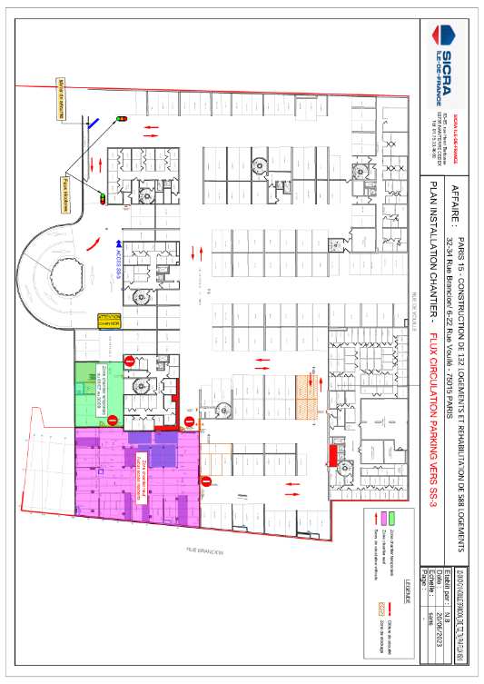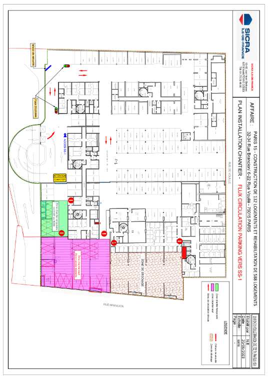 Dans le cadre de la construction de la résidence étudiante au 32-34 Rue Brancion, nous vous informons que des travaux de sciage de dalle béton débuteront dans les parkings souterrains à partir du 4 juillet 2023. Ces travaux seront réalisés dans les trois niveaux de sous-sol, dans la zone verte et rose sur les plans ci-dessous schéma ci-dessous.