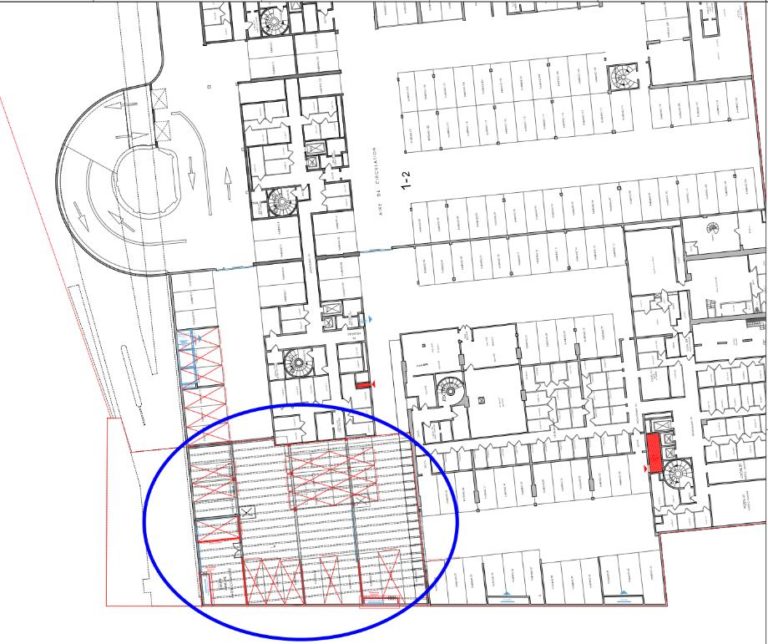 Dans le cadre de la construction de la résidence étudiante au 32-34 Rue Brancion, nous vous informons que des travaux de sondage au marteau perforateur auront lieu dans les parkings souterrains à partir du 19 juin 2023. Ces sondages seront réalisés au 1er sous-sol dans la zone du parking identifiée sur le schéma ci-dessous et au fond des places déjà fermées.